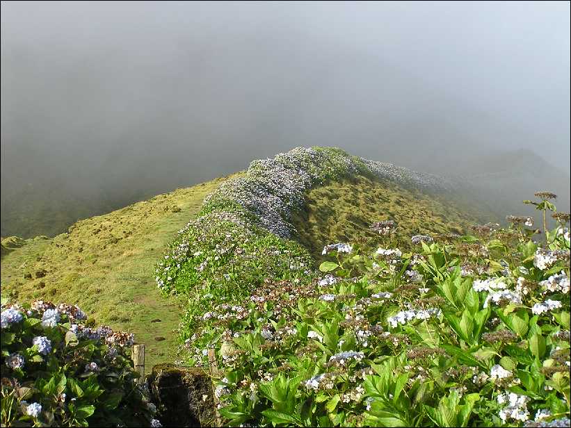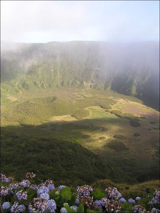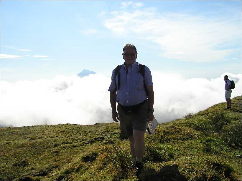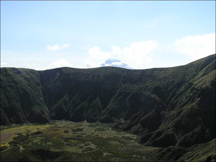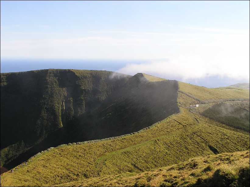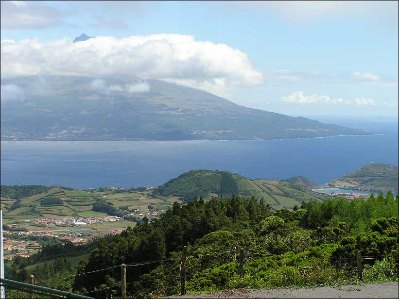 Parkplatz mit Fußgängertunnel Kraterrand Kraterkessel mit Baumbestand Blick Richtung Horta Kraterrand Im Hintergrund die Spitze vom Pico Kraterkessel Kraterrand mit Pico im Hintergrund Blick in die Ferne Insel Pico