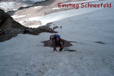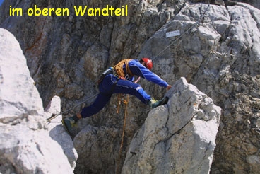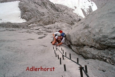 Da wir mit unseren Raxfreunden in der Forstau Urlaub machten und der Wetterbericht für den nächsten Tag schönes Wetter versprach, haben wir beschlossen, den "Johann" zu gehen. 23. Juli 2002: nach dem Frühstück in der Hütte, die wir für unseren Urlaub gemietet haben, fuhren wir mit dem Auto zum Parkplatz der Dachsteinseilbahn. In 45 min sind wir zur Dachstein-Südwand-Hütte gewandert und haben dort noch einige Erkundigungen über den Klettersteig eingeholt. Dann ging`s los. 1 1/2 Stunden haben wir für den Zustieg gebraucht. Auf unmarkiertem Weg, Steigspuren jedoch vorhanden ( da der Steig auch zur Dachstein-Südwand führt ), über eine ca. 100m hohe, gegliederte Wandstufe mit teilweise leichter Kletterei. Zwischendurch sind auch einige steile und sehr harte Schneefelder zu queren ( Steigeisen oder Grödeln mitnehmen ist empfehlenswert ). Einen Grashang empor und bei einer deutlichen Markierung nach links bis zu einer markanten Felsnadel. Einstieg, Beginn der Versicherung und Anseilplatz. Dann der Einstieg selbst: meiner Meinung nach der schwierigste Teil vom Steig! Ein riesiger Überhang, nur mit 5-6 kräftigen Klimmzüge zu bewältigen, nach dem 3. Versuch, dieses mal ohne Rucksack, habe ich es endlich geschafft. Beide Rucksäcke aufgeseilt, dann Regina fest gesichert und ruck zuck stand sie auch schon neben mir. Der Rest vom Aufstieg war zwar sehr lang, aber auch ein Genuss! Zuerst eine große Rampe empor; ca. 700, aber sehr gut versichert, dann ein steiler Wandabbruch und anschließend einige Meter Gehgelände ( hier quert der Pfannl/Maischberger Weg ). Dann einige Wasserrillen hinauf zu einem markanten Felskopf, über einem Band folgt ein schwieriger Quergang und 15m höher ist man schon beim Adlerhorst ( Wandbuch, wo wir uns selbstverständlich eingetragen haben! ). Dann ging es weiter über eine endlos lange "Trittbolzenleiter" zum "Jausenplatz-Südwandblick". Kurze Rast. Den Grat mit mehreren Steilaufschwüngen, einen riesigen Spreizschritt und einen kleinen Überhang hinauf und wir waren schon auf der Ausstiegsrampe. Nur noch einige Meter und wir standen vor der Dachsteinwarte. Wir waren von 11h bis 15h am Steig unterwegs und das nun folgende Bier habe ich mir ehrlich verdient ( das Schnäpschen auch! ). In 30 min zur Dachsteinseilbahn, Abfahrt in`s Tal und zurück zu unseren Bergfreunden. |