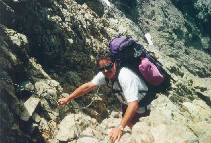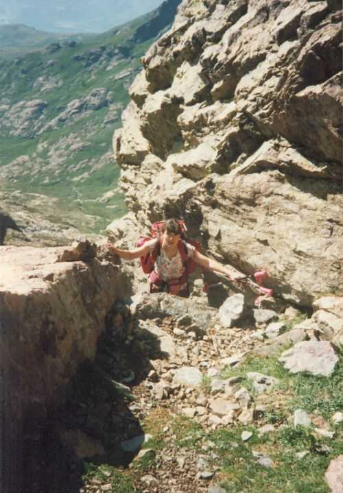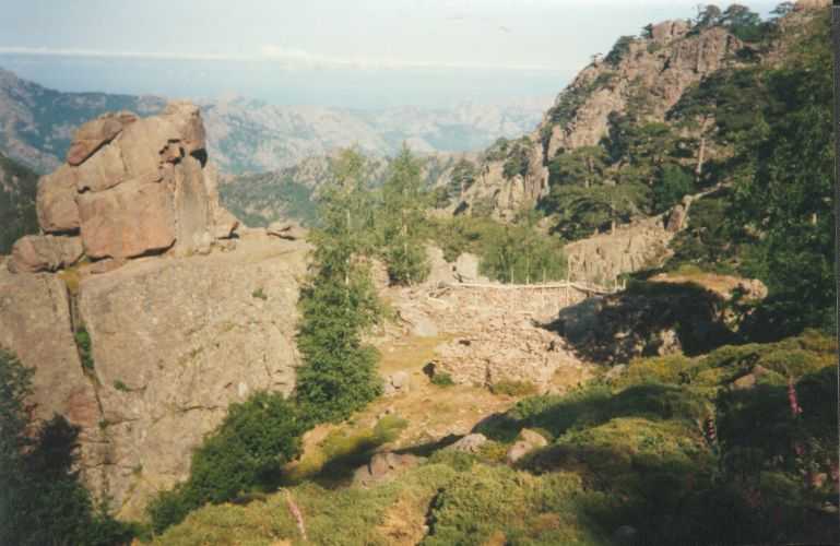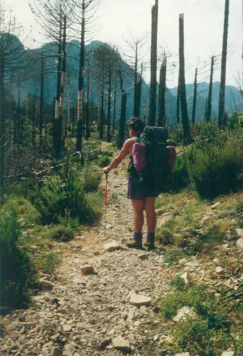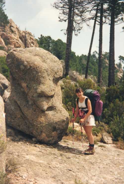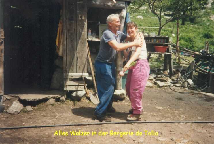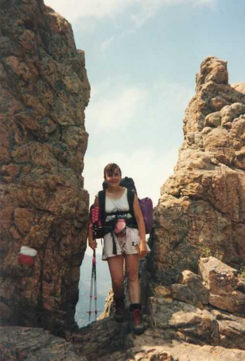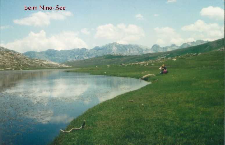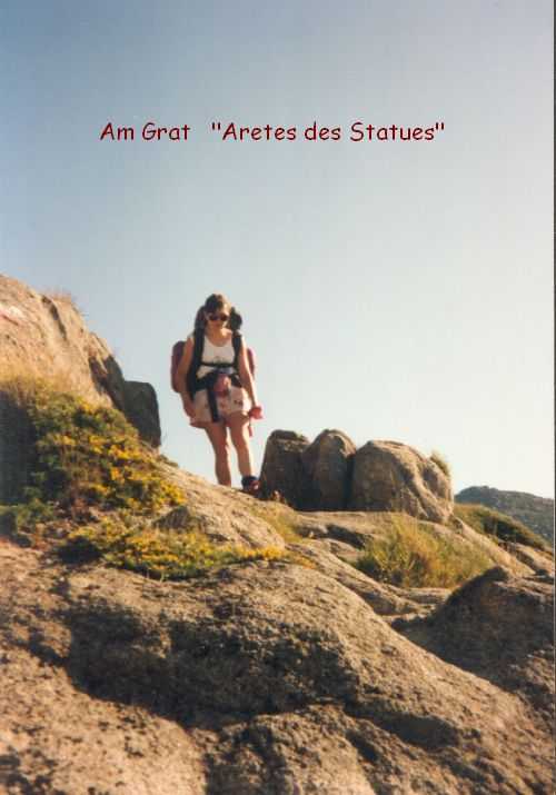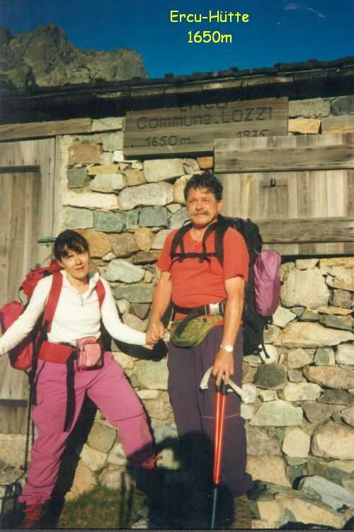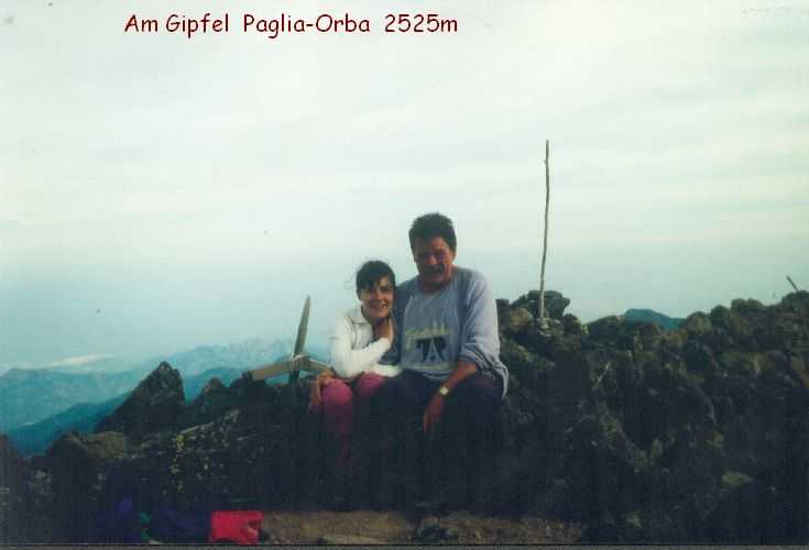 2lh30 Zelt aufgestellt, 22h Essen und Stadtbummel, mit kleinem Schwips nach Hause gekommen und sofort eingeschlafen. So. 13. 6. 93 Um 7h Aufgeweckt worden, gemeinsames Frühstück mit Tee, Kakao und Kaffee und den von der Reise übrig gebliebenen Wurstbroten. Zelt abgebrochen, Auto wieder beladen und um l0h war Abfahrt nach CALENZANA, wo uns die Ilse rausschmiss und wir unsere Tour "GR20" um 10h30 begannen. So.13.6.93 /10h30 - - - 1. Etappe - - - 9Km Von Calezana zum Ref. d' Ortu di Piobbu über Bocca a Corsu, kurze Rast unter einem Kastanienbaum mit mehr als 7 m Umfang, weiter über die Bocca a Saltu ( 1250m) zur Hütte. Weg sehr schön, das Wetter etwas weniger schön. Gehzeit samt einiger kurzen Rastpausen: 7 1/2 Std. Mo. 14. 6. 93 - - - 2. Etappe - - - 6Km Zum Refuge de Carozzu. Nach angenehmer Nacht und gutem Frühstück um 8h aufgebrochen. Über Col Piscaghia (2000m) und Col d'Avartoli (1898m) steil hinab zum Refuge de Carozzu. Gehzeit mit kurzer Rast = 7 1/2 Std. Wetter heute etwas besser. Di.15.6.93 - - - 3. Etappe - - - 4Km Haut Asco - Refuge de Stagnu Pünktlich um 8h weggegangen. Auf das Wiedersehen mit Ilse gefreut, das beflügelte unser Tempo. Nach einer 1/2 Std. bei einer Hängebrücke angelangt, wo das Herz fast in die Hose rutschte, weiter zum Muvrella - See und zur Breche de Stagnu ( 1985m ) = Osterhasenscharte . Waren zur Zeit noch gut im Rennen. Kurzes Stück über dem Kamm und steil hinunter und zum Hotel, wo das Bier schon sehnsüchtig auf mich wartete ( und die Ilse auf uns. ). Freudiges Wiedersehen, kurze Rast und Fahrt mit Ente nach Lozzi und noch 7Km Schotter + Schlaglochstrasse steil hinauf zum Parkplatz für Monte Cinto-geher. Nach einiger Hin- und Hersucherei die "Ercu Hütte" endlich, um 21 h30, gefunden. Frisches Baquett, Corsische Wurst und Rotwein ( von Ilse besorgt) war die Belohnung für die Anstrengung des heutigen Tages. Mi. 16. 6. 93 - - - - - - Besteigung des Monte Cinto 2706m 5h15 unsanft von Regina aus dem Schlaf gerissen worden. Sofort mit dem Frühstückkochen begonnen, gefrühstückt und Rucksack gepackt und um 7h zum Monte Cinto (2706m) aufgebrochen. Den Steinmännchen nach, die nicht immer leicht zu finden waren, sind wir höher und höher gestiegen, teilweise geklettert. ( wo sich die Damen gefürchtet haben. ) Nach ca. 2/3 vom Weg ( etwa 2300m ), es war schon nach 11 h, haben wir beschlossen, daß nur ich auf den Gipfel gehen sollte, da es für Ilse zu anstrengend wurde. War um 13h30 am Gipfel des Monte Cinto, der inzwischen in Wolken gehüllt war, nur damit ich keine schöne Aussicht habe. ( bösartiger Mt. Schindo !!! ) Beim Abstieg zu den Damen, die schon 1/3 vom Abstieg hinter sich hatten, verlief ich mich und kam viel zu weit nach Rechts ( anderer Weg zum Gipfel). Nach längerer Sucherei und Schinderei entdeckte ich Ilse und Regina endlich ca. 200m über mir in einer Felsrinne wartend, weil sie sich nicht weiter Absteigen trauten. Ich lief hinauf und seilte sie ab. Nun ging es problemlos zur Hütte, wo wir um 17h45 ankamen. Zurückgelassenes Gepäck aufgenommen und um 18h30 zurück zur Ente ( 19h30). Fahrt nach Haute Asco, Ankunft 22h15. Haben nur mehr Sandviches bekommen ( mit Käse - sehr gut geschmeckt!! ) und Rotwein getrunken. In der Garage ( Schlaflager) ins Bett gefallen und todmüde sofort eingeschlafen. Do. 17.6.93 - - - 4. Etappe - - - 5,5 Km Um 6h30 aufgestanden, im Restaurant gut gefrühstückt Käse gekauft und den von Ilse mitgebrachten Nachschub im Rucksack verstaut, der um einiges schwerer wurde. 8h30 von Ilse verabschiedet und zum Ref. Tighiettu losmarschiert. Nach ca. 2 Std. bei der Ruine von der Altore Hütte Rast gemacht. Aufgestiegen zum Col de Perdu ( 2183m ). Steiles Abklettern in die Schlucht ( der Einsamkeit ), damit wir auf der anderen Seite genußvoll raufklettern konnten, zur Bocca Minuta (2218m ). 16h Abstieg über Platten und Geröll, bei kaltem Wind zur Hütte in 1 1/2 Std. Endlich wieder warmes Essen nach 2 Tagen und die erste Dusche seit Beginn der Tour. Fr. 18. 6. 93 - - - 5. Etappe - - - 6Km Vom Stranciacone-Tal bis an den Fuß der Paglia-Orba 2525m (dem Matterhorn Korsikas) zum Ref. Ciottuli di Mori.- Von der Hütte, wo wir um 7h aufstanden und gemütlich frühstückten, ging es um ca. 9h hinab ins Tal, vorbei an der Bergerie de Ballone, die aber geschlossen war, da der Hirte einkaufen gegangen ist. Im Tal angekommen, ging es dann wieder 600Hm, teilweise steil, hinauf zur Bocca di Foghieghiallu ( 1962m ). Auf breitem Paßbuckel in 20 Minuten zur Hütte. Es ist 14h, rundherum stiegen Wolken auf und so wir haben beschlossen, noch nicht auf die Paglia - Orba zu gehen. Keine Fernsicht - kein Spass ! Da wir um 5h aufstehen wollten, gingen wir zeitig Schlafen mit Vorfreude auf den nächsten Tag. Sa. 19.6.93 - - - 6. Etappe - - - 8 Km Dieser Tag begann wirklich um 5h früh! Wir hörten den Wecker, standen auch gleich auf und schlichen aus dem Schlafraum. Kurzes Frühstück und Aufbruch um 6h auf das Matterhorn Corsicas - die Paglia Orba (2525m). Wirklich der schönste Berg der Insel. Einige kurze Kletterstellen im 2.-3. Grad, aber sehr guter, griffiger Fels. Nach 2 Std. und etwas Fürchten standen wir am Gipfel. Ein schönes Gefühl. 8h30 bis 10h30 Abstieg, das letzte Hinderniss haben wir durch Abseilen überwunden. Bei der Hütte Suppe gekocht und auch gegessen, dann ging es eiligen Schrittes weiter, da wir mit Ilse um 16h beim Castel di Verghio ein Treffen ausgemacht hatten. Gingen aber trotzdem bei der erstbesten von ca. 3 Dutzend Badegumpen, die auf unserem Weg waren, kurz Baden ( sehr kalt, aber herrlich). Um 15h endete unser Weg an einer Strassenkehre, wo uns ein ca. 2km langer Hatscher zum Hotel führen sollte. Im selben Augenblick kurvte Ente mit Ilse die Straße rauf, die uns freudig aufnahm und uns zu unserem Etappenziel mitnahm. Die Freude über unser vorzeitiges Treffen war groß und wurde ( von mir) mit einem Bier begossen. Es gab noch viel zu Quatschen und zu Berichten und Nachschub zu verteile