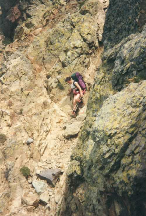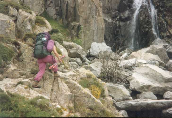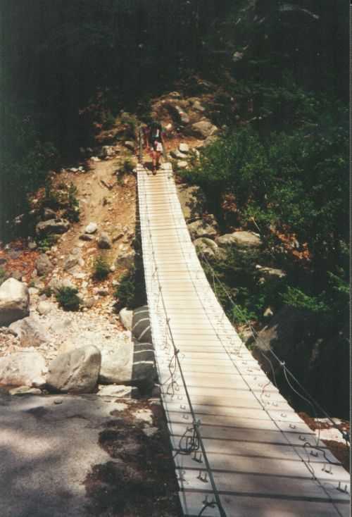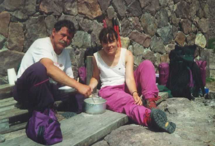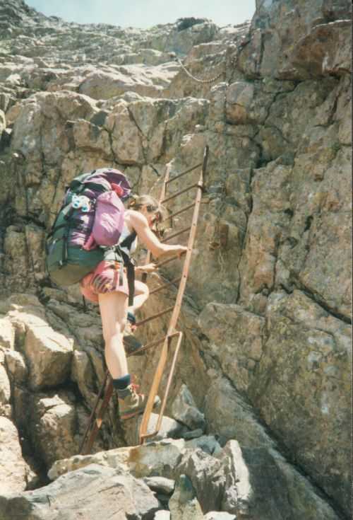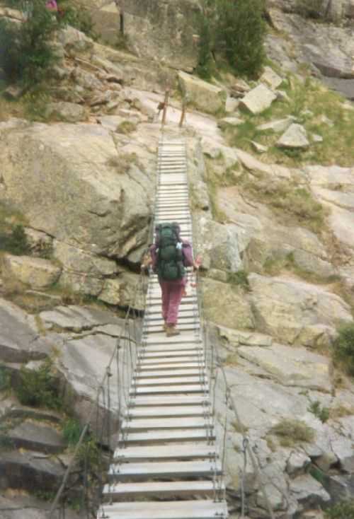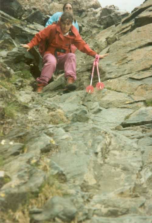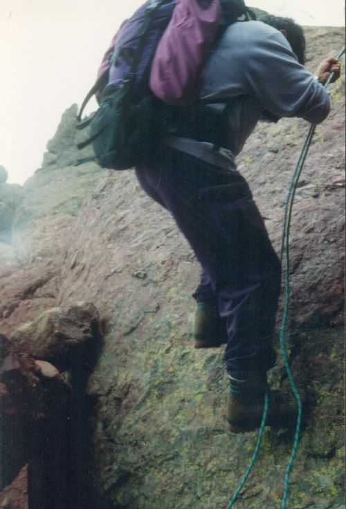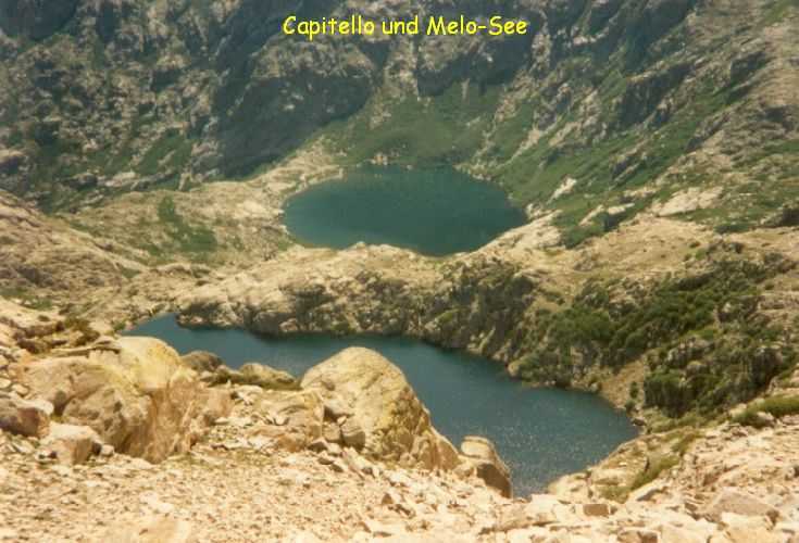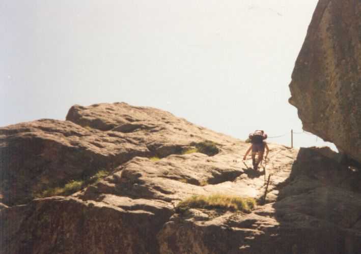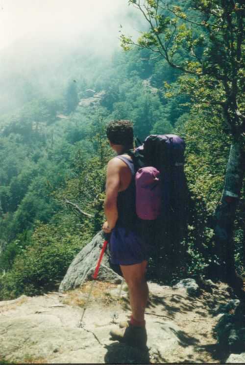 2lh30 Zelt aufgestellt, 22h Essen und Stadtbummel, mit kleinem Schwips nach Hause gekommen und sofort eingeschlafen. So. 13. 6. 93 Um 7h Aufgeweckt worden, gemeinsames Frühstück mit Tee, Kakao und Kaffee und den von der Reise übrig gebliebenen Wurstbroten. Zelt abgebrochen, Auto wieder beladen und um l0h war Abfahrt nach CALENZANA, wo uns die Ilse rausschmiss und wir unsere Tour "GR20" um 10h30 begannen. So.13.6.93 /10h30 - - - 1. Etappe - - - 9Km Von Calezana zum Ref. d' Ortu di Piobbu über Bocca a Corsu, kurze Rast unter einem Kastanienbaum mit mehr als 7 m Umfang, weiter über die Bocca a Saltu ( 1250m) zur Hütte. Weg sehr schön, das Wetter etwas weniger schön. Gehzeit samt einiger kurzen Rastpausen: 7 1/2 Std. Mo. 14. 6. 93 - - - 2. Etappe - - - 6Km Zum Refuge de Carozzu. Nach angenehmer Nacht und gutem Frühstück um 8h aufgebrochen. Über Col Piscaghia (2000m) und Col d'Avartoli (1898m) steil hinab zum Refuge de Carozzu. Gehzeit mit kurzer Rast = 7 1/2 Std. Wetter heute etwas besser. Di.15.6.93 - - - 3. Etappe - - - 4Km Haut Asco - Refuge de Stagnu Pünktlich um 8h weggegangen. Auf das Wiedersehen mit Ilse gefreut, das beflügelte unser Tempo. Nach einer 1/2 Std. bei einer Hängebrücke angelangt, wo das Herz fast in die Hose rutschte, weiter zum Muvrella - See und zur Breche de Stagnu ( 1985m ) = Osterhasenscharte . Waren zur Zeit noch gut im Rennen. Kurzes Stück über dem Kamm und steil hinunter und zum Hotel, wo das Bier schon sehnsüchtig auf mich wartete ( und die Ilse auf uns. ). Freudiges Wiedersehen, kurze Rast und Fahrt mit Ente nach Lozzi und noch 7Km Schotter + Schlaglochstrasse steil hinauf zum Parkplatz für Monte Cinto-geher. Nach einiger Hin- und Hersucherei die "Ercu Hütte" endlich, um 21 h30, gefunden. Frisches Baquett, Corsische Wurst und Rotwein ( von Ilse besorgt) war die Belohnung für die Anstrengung des heutigen Tages. Mi. 16. 6. 93 - - - - - - Besteigung des Monte Cinto 2706m 5h15 unsanft von Regina aus dem Schlaf gerissen worden. Sofort mit dem Frühstückkochen begonnen, gefrühstückt und Rucksack gepackt und um 7h zum Monte Cinto (2706m) aufgebrochen. Den Steinmännchen nach, die nicht immer leicht zu finden waren, sind wir höher und höher gestiegen, teilweise geklettert. ( wo sich die Damen gefürchtet haben. ) Nach ca. 2/3 vom Weg ( etwa 2300m ), es war schon nach 11 h, haben wir beschlossen, daß nur ich auf den Gipfel gehen sollte, da es für Ilse zu anstrengend wurde. War um 13h30 am Gipfel des Monte Cinto, der inzwischen in Wolken gehüllt war, nur damit ich keine schöne Aussicht habe. ( bösartiger Mt. Schindo !!! ) Beim Abstieg zu den Damen, die schon 1/3 vom Abstieg hinter sich hatten, verlief ich mich und kam viel zu weit nach Rechts ( anderer Weg zum Gipfel). Nach längerer Sucherei und Schinderei entdeckte ich Ilse und Regina endlich ca. 200m über mir in einer Felsrinne wartend, weil sie sich nicht weiter Absteigen trauten. Ich lief hinauf und seilte sie ab. Nun ging es problemlos zur Hütte, wo wir um 17h45 ankamen. Zurückgelassenes Gepäck aufgenommen und um 18h30 zurück zur Ente ( 19h30). Fahrt nach Haute Asco, Ankunft 22h15. Haben nur mehr Sandviches bekommen ( mit Käse - sehr gut geschmeckt!! ) und Rotwein getrunken. In der Garage ( Schlaflager) ins Bett gefallen und todmüde sofort eingeschlafen. Do. 17.6.93 - - - 4. Etappe - - - 5,5 Km Um 6h30 aufgestanden, im Restaurant gut gefrühstückt Käse gekauft und den von Ilse mitgebrachten Nachschub im Rucksack verstaut, der um einiges schwerer wurde. 8h30 von Ilse verabschiedet und zum Ref. Tighiettu losmarschiert. Nach ca. 2 Std. bei der Ruine von der Altore Hütte Rast gemacht. Aufgestiegen zum Col de Perdu ( 2183m ). Steiles Abklettern in die Schlucht ( der Einsamkeit ), damit wir auf der anderen Seite genußvoll raufklettern konnten, zur Bocca Minuta (2218m ). 16h Abstieg über Platten und Geröll, bei kaltem Wind zur Hütte in 1 1/2 Std. Endlich wieder warmes Essen nach 2 Tagen und die erste Dusche seit Beginn der Tour. Fr. 18. 6. 93 - - - 5. Etappe - - - 6Km Vom Stranciacone-Tal bis an den Fuß der Paglia-Orba 2525m (dem Matterhorn Korsikas) zum Ref. Ciottuli di Mori.- Von der Hütte, wo wir um 7h aufstanden und gemütlich frühstückten, ging es um ca. 9h hinab ins Tal, vorbei an der Bergerie de Ballone, die aber geschlossen war, da der Hirte einkaufen gegangen ist. Im Tal angekommen, ging es dann wieder 600Hm, teilweise steil, hinauf zur Bocca di Foghieghiallu ( 1962m ). Auf breitem Paßbuckel in 20 Minuten zur Hütte. Es ist 14h, rundherum stiegen Wolken auf und so wir haben beschlossen, noch nicht auf die Paglia - Orba zu gehen. Keine Fernsicht - kein Spass ! Da wir um 5h aufstehen wollten, gingen wir zeitig Schlafen mit Vorfreude auf den nächsten Tag. Sa. 19.6.93 - - - 6. Etappe - - - 8 Km Dieser Tag begann wirklich um 5h früh! Wir hörten den Wecker, standen auch gleich auf und schlichen aus dem Schlafraum. Kurzes Frühstück und Aufbruch um 6h auf das Matterhorn Corsicas - die Paglia Orba (2525m). Wirklich der schönste Berg der Insel. Einige kurze Kletterstellen im 2.-3. Grad, aber sehr guter, griffiger Fels. Nach 2 Std. und etwas Fürchten standen wir am Gipfel. Ein schönes Gefühl. 8h30 bis 10h30 Abstieg, das letzte Hinderniss haben wir durch Abseilen überwunden. Bei der Hütte Suppe gekocht und auch gegessen, dann ging es eiligen Schrittes weiter, da wir mit Ilse um 16h beim Castel di Verghio ein Treffen ausgemacht hatten. Gingen aber trotzdem bei der erstbesten von ca. 3 Dutzend Badegumpen, die auf unserem Weg waren, kurz Baden ( sehr kalt, aber herrlich). Um 15h endete unser Weg an einer Strassenkehre, wo uns ein ca. 2km langer Hatscher zum Hotel führen sollte. Im selben Augenblick kurvte Ente mit Ilse die Straße rauf, die uns freudig aufnahm und uns zu unserem Etappenziel mitnahm. Die Freude über unser vorzeitiges Treffen war groß und wurde ( von mir) mit einem Bier begossen. Es gab noch viel zu Quatschen und zu Berichten und Nachschub zu verteile