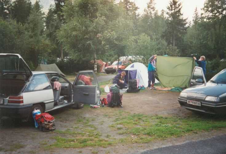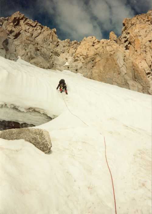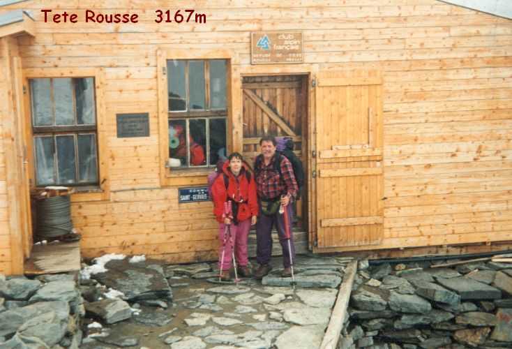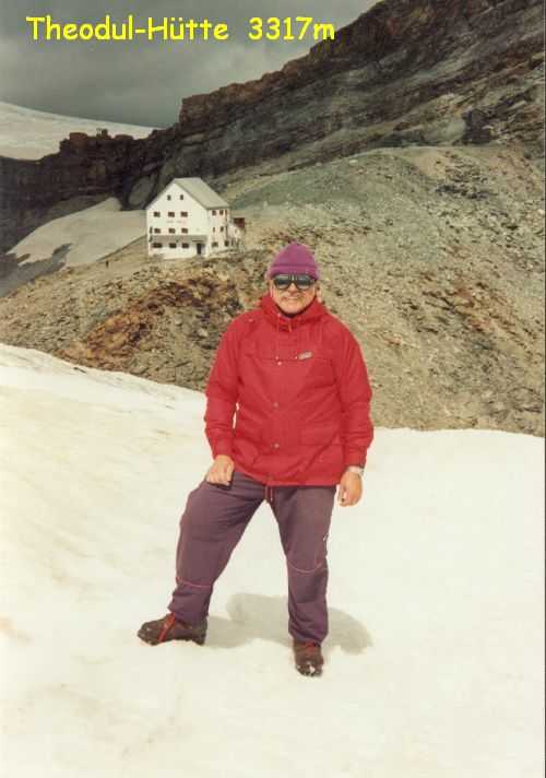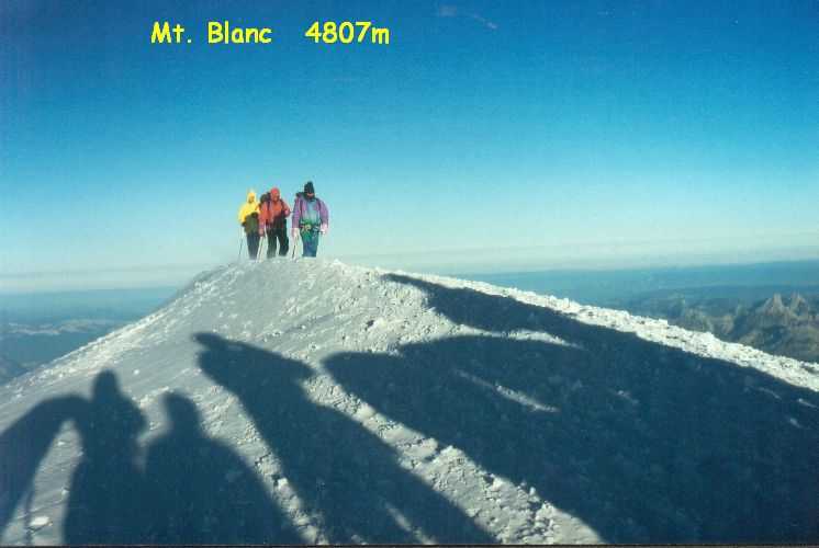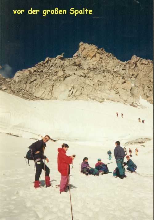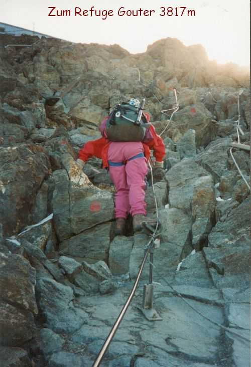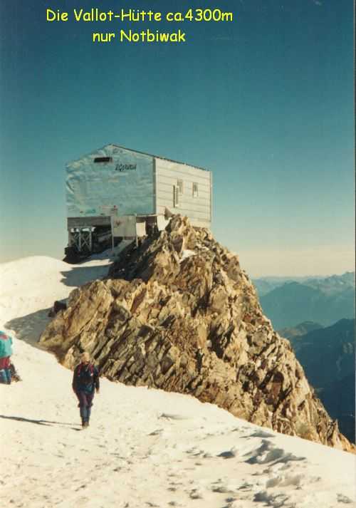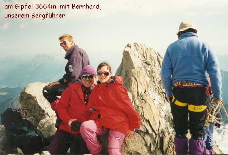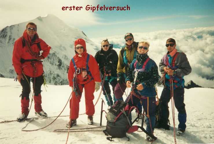 19. August 1994 Das Wetter hatte sich verschlechtert, bei eisiger Kälte und starkem Sturm versuchten wir dennoch, auf das Breithorn ( 4164m )zu gehen - um uns für den Mt. Blanc zu Akklimatisieren. Wir kamen aber nur bis zur Seilbahnstation "Kleinmatterhorn" ( 3884m ), denn es wurde auch immer nebeliger und die Sicht nahm immer mehr ab. So entschlossen wir uns umzukehren und auf die Theodulo-Hütte zurückzugehen. 20. August 1994 Abstieg bei herrlichem Wetter und Windstille zum "trockenen Steg", Abfahrt mit der Seilbahn nach Zermatt und mit dem Zug nach Brigg, wo wir uns mit Ilse wieder getroffen haben. 21. August 1994 Um 12h haben wir uns in "le Tour", Nähe Chamonix, mit unserer Gruppe vom Alpenverein getroffen, um gemeinsam den Mt. Blanc zu besteigen. Ilse vergnügte sich einstweilen in Chamonix und Umgebung und wir begannen unsere geplanten Touren. Sind von Le Tour ein Stück mit der Seilbahn aufgefahren, dann zu Fuß auf 2702m zum Ref. Albert I, bei herrlichem Wetter und Hitze. Aufstieg samt Seilbahn von 13h bis 17h. 21h30 Nachtruhe. 22. August 1994 Sind um 5h aufgestanden, um 6h war Abmarsch Richtung Aig. de Tour 3644m. Leichte Gletschertour, auf den letzten 200 m noch eine Riesenspalte gequert, dann noch eine leichte Kletterei auf den Gipfel. 12h30 waren wir oben. Kurze Rast, dann Abstieg über Ref. Albert I und Charamillon-See zur Mittelstation Col de Balme und von dort mit der Seilbahm ins Tal. Camping in Chamonix. 23. und 24. August 1994 einige kleine Touren in der Umgebung bei sehr miesem Wetter gemacht, hofften auf Wetterbesserung. 25. August 1994 Nach einer, wieder einmal, verregneten Nacht haben wir um 7h45 gefrühstückt und die Zelte abgebrochen.Um 10h30 sind wir nach "Les Houches" gefahren und um 12h30 mit der Seilbahn die ersten 800Hm gemütlich zur Station Bellevue auf 1800m raufgefahren. Jetzt wurde es ernst. Zeitweise im Nebel und bei leichtem Schneefall sind wir von 12h40 bis 17h15 zum Ref. Tete Rousse 3167m aufgestiegen. Gutes Abendessen, kaltes Lager - leider hat jemand seinen Hund ins Lager mitgenommen. Da Regina jedoch allergisch auf Hunde ist, hat sie deshalb schlecht geschlafen. 26. August 1994 Um 7h gab´s Frühstück und um 8h30 sind wir zum Ref. Gouter 3817m aufgebrochen. Beim Aufstieg ist eine steinschlaggefährdete Eisrinne zu queren, man sollte wirklich nur vor Mittag diese Stelle passieren. Dann ging es mit leichter Kletterei problemlos zur Hütte, wo wir um 11h30 angekommen sind. Das Wetter war noch immer mies und es wurde auch immer stürmischer. Nach dem Mittagessen versuchten wir, dennoch den Gipfel zu erreichen, mußten aber in einer Höhe von ca. 4100m umkehren. Obwohl wir keinen Schlafplatz für uns bestellen konnten, haben wir 5 Lagerplätze für uns 7 bekommen. Es war sehr eng, jedoch besser, als im Gastraum im Sitzen zu schlafen. 27. August 1994 1h45 sind wir aufgestanden haben unsere Sachen zusammengepackt und gefrühstückt. Von 3h bis 5h früh Aufstieg zur Vallot Hütte auf 4300m, kurze Rast. Das Wetter war herrlich! Sternenklarer Himmel und relativ warm, nur etwas stürmisch. 5h30 bis 7h war Gipfelsturm. Herrlicher Sonnenaufgang um 6h15. Die letzten 200hm waren eine fürchterliche Plage (war ich ja das erste mal auf so einer Höhe!). Und dann noch der ewig lange Grat bis zum Gipfel! Aber um 7h15 hatten wir es endlich geschafft. Wir standen bei eisigem Sturm am Gipfel auf 4807m. Einige Fotos gemacht und den heißen Tee aus der Thermosflasche sehr genossen. Ca. 7h45 bis 8h30 Abstieg zur Vallot-Hütte, kurze Rast, dann weiter bis 10h15 zum Ref. Gouter. Unser restliches Gepäck in den Rucksack gepackt und von 11h15 bis 13h30 Abstieg zum Ref. Tete-Rousse. Mußten natürlich wieder diese heikle Eisrinne queren und da merkten wir erst, da es ja schon relatv spät war, wie stark Steinschlaggefähdet diese Rinne war. Im Minutentakt kamen Steine von oben auf uns zugeflogen. Doch wir sind alle heil vorbeigekommen. Kurze Rast auf der Hütte, dann ging es im Eiltempo weiter zur Seilbahnstation "Bellevue" wo wir kurz vor der letzten Abfahrt angekommen sind. Mit der Seilbahn ab ins Tal, dadurch haben wir uns weitere 800Hm Abstieg erspart. Sind ja heute genug gegangen! 1000Hm im Aufstieg und 3000sm im Abstieg! In Chamonix haben wir kurz unseren Gipfelsieg gefeiert, uns von unserer Gruppe verabschiedet, denn die mußten nach Hause fahren. Wir blieben, da wir ja mit Ilse noch ein paar Tage hier verbringen wollten. |